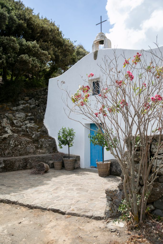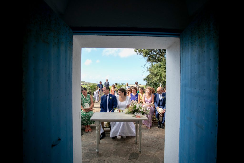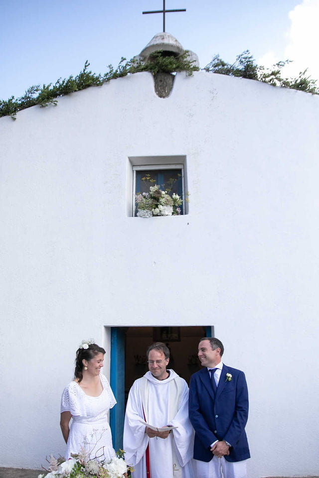 The ceremony happens in front of Church of Sant’Antonio, a small structure that sits quietly within this environment. Guests gather without a defined formation, adjusting naturally to light and distance. There is no moment where everything “starts.” It is already happening.
