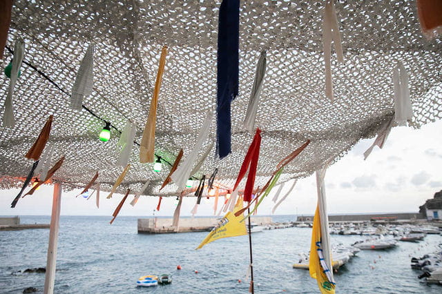 Above the port, the space gathers everyone again. Tables fill gradually, chairs adjust, bodies lean closer. The sea remains present in the background, while attention moves toward what is happening at the table.